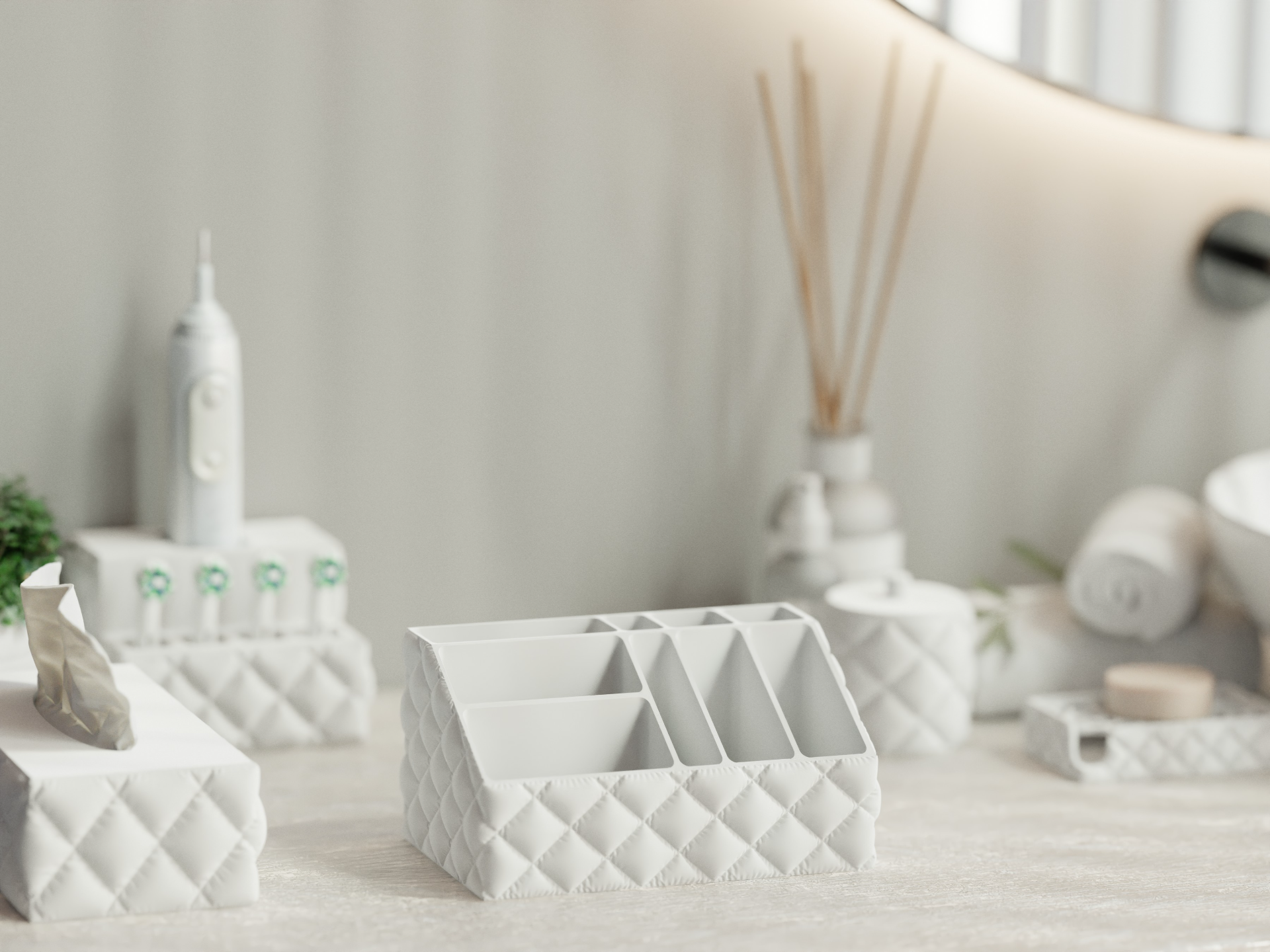 This modern makeup organizer is 3D printed in the UK and thoughtfully crafted to combine clean aesthetics with practical storage — perfect for bathrooms, vanities, desks, or dressing tables.