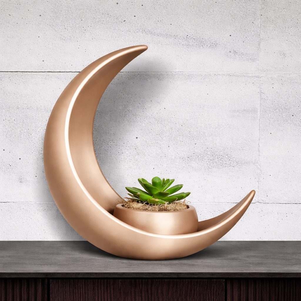 Featuring an integrated elliptical plant pot, this crescent moon design works beautifully with succulents, small plants, or artificial greenery. Its balanced proportions and smooth detailing create a serene focal point without overwhelming your space — perfect for minimalist and modern interiors alike.